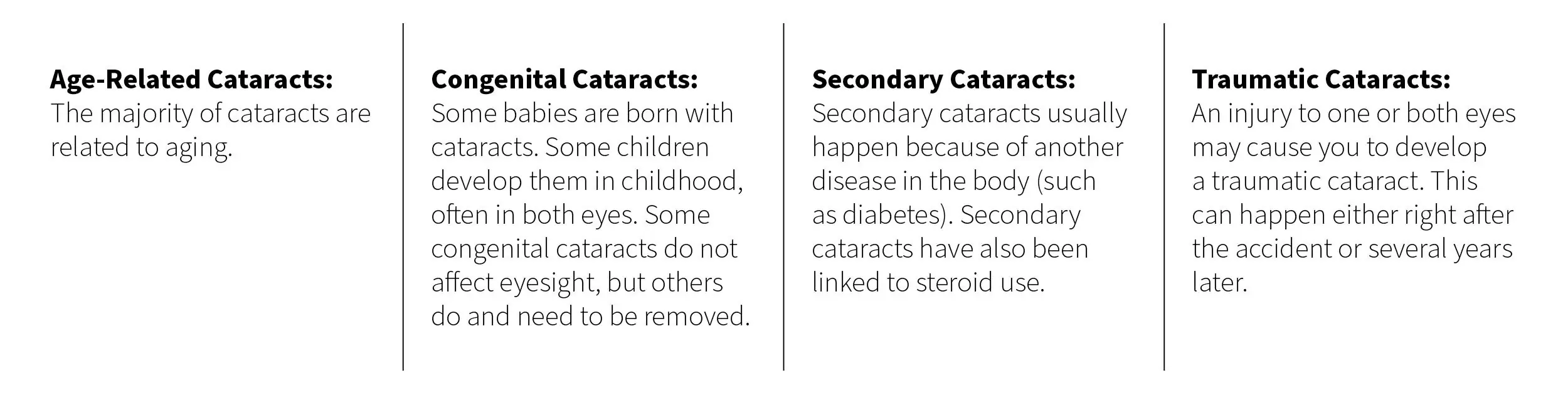 Experts from Johns Hopkins also explain the different types of cataracts, since some patients will be diagnosed with cataracts early in life—and from other causes.